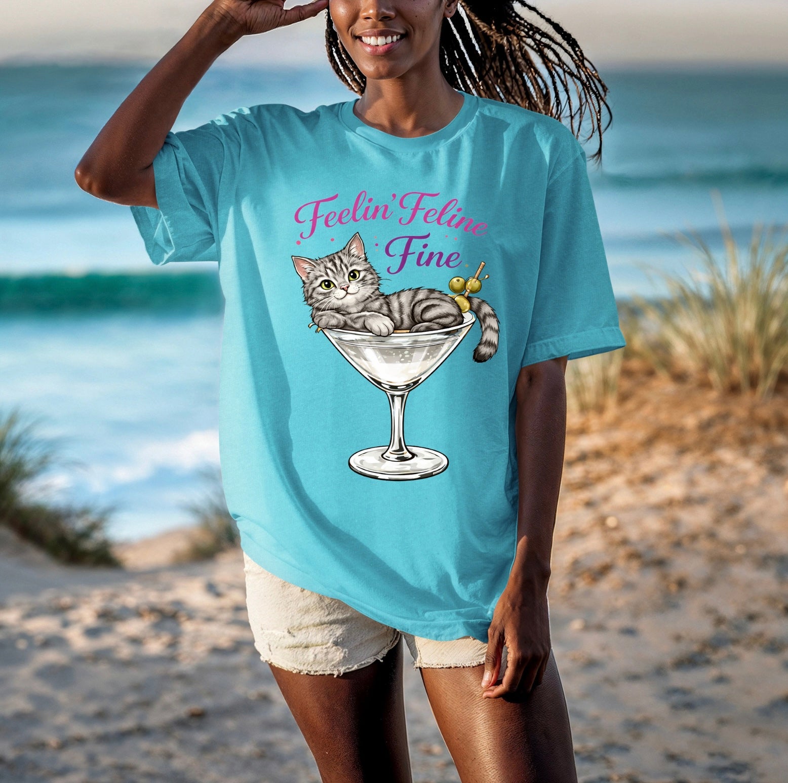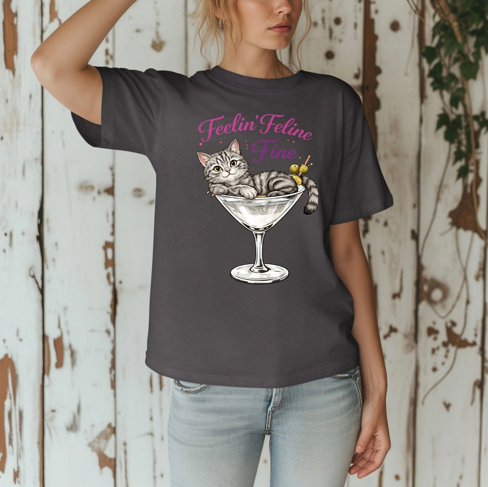 Meet your new favorite statement tee. The “Purrfect.” shirt blends cozy charm with cocktail-hour confidence, featuring a painterly digital illustration of a gray tabby and/or black cat relaxing in a martini glass and cuteness. Whether you’re headed to brunch, lounging at home, or gifting a fellow cat-obsessed friend, this tee delivers effortless style with a wink.